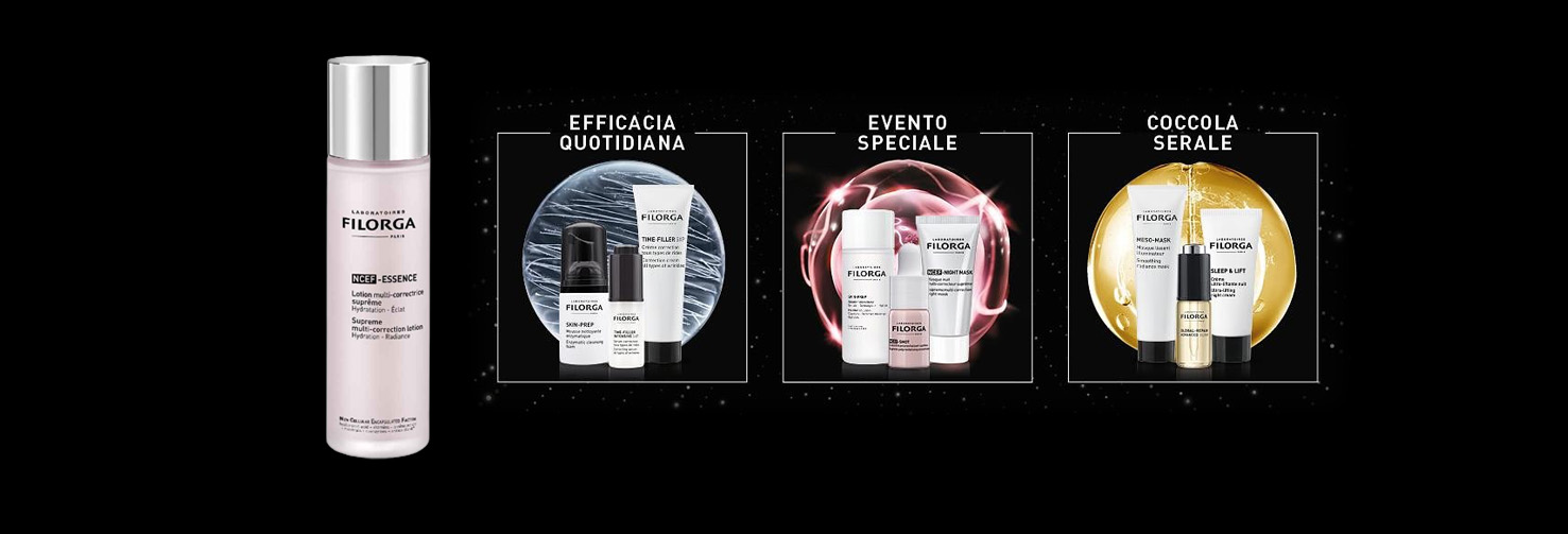 Acquista 2 prodotti Filorga (escluse le maschere) e ricevi in omaggio uno dei Kit Compleanno con 3 prodotti in formato speciale della linea: